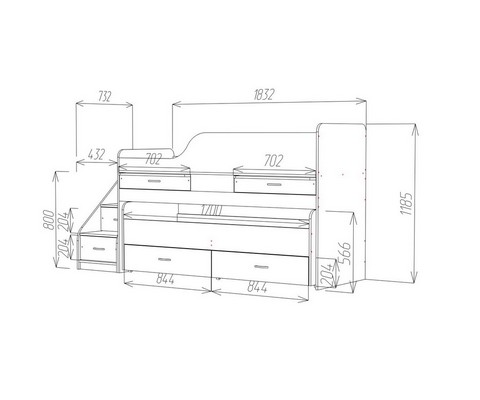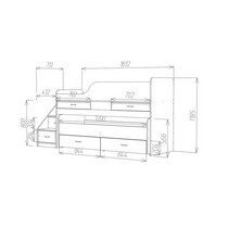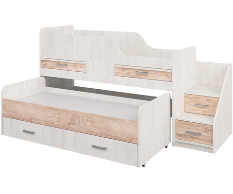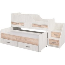 Оснащение: два спальных места, нижний ярус задвигается, два ящика полного выдвижения на шариковых направляющих, два выдвижных стола, мобильный и устойчивый приставной комод-лесенка на два ящика.