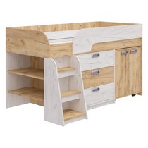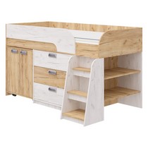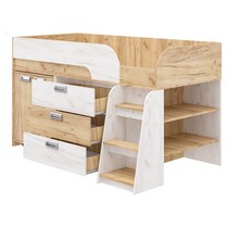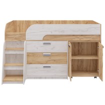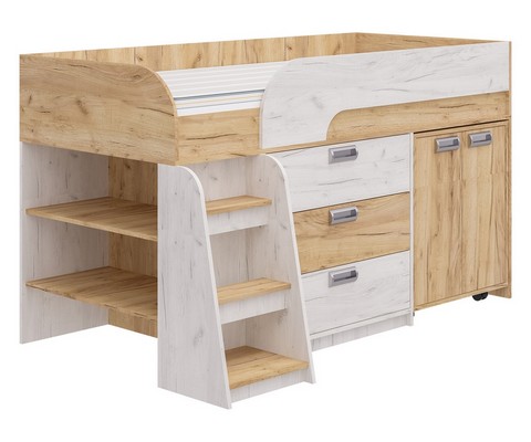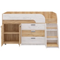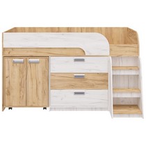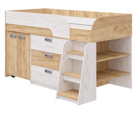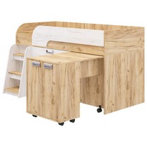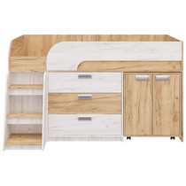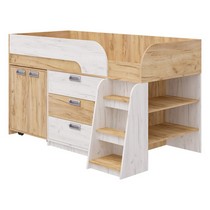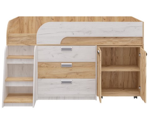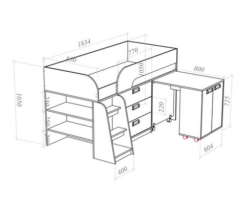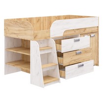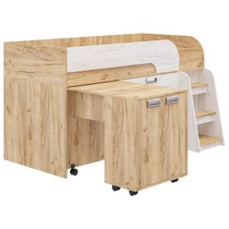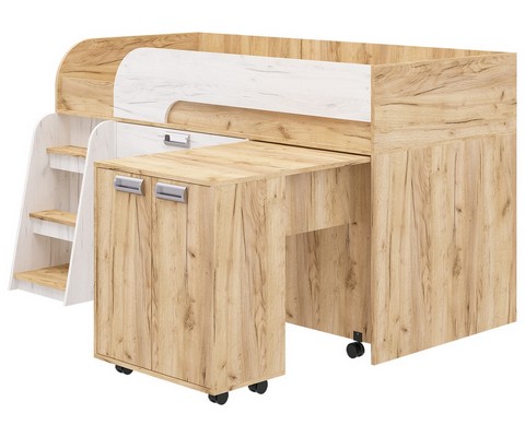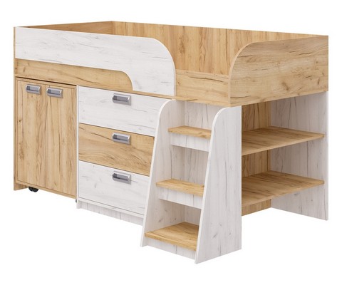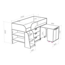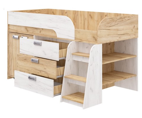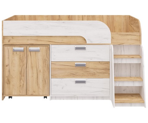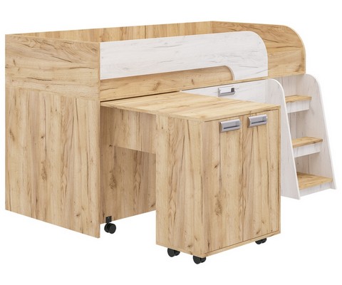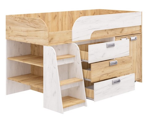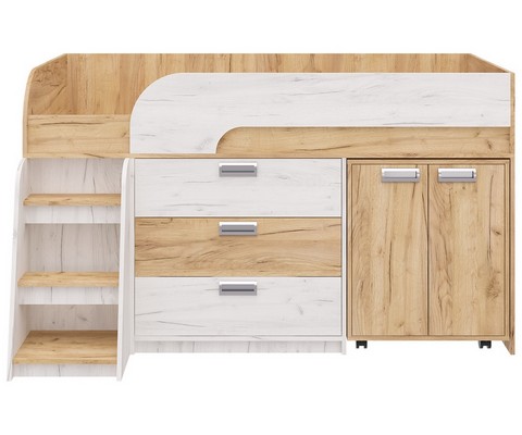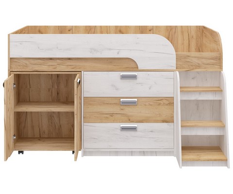 Модель включает: спальное место 180х80см с ограничительным радиусным бортиком устойчивая лесенка без металлических элементов три вместительных ящика полного выдвижения на шариковых направляющих две открытые ниши, глухой шкафчик с двумя полками мобильный стол-трансформер, на фасадах используются современные фигурные ручки.