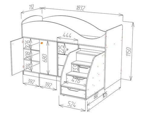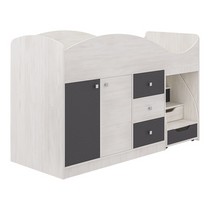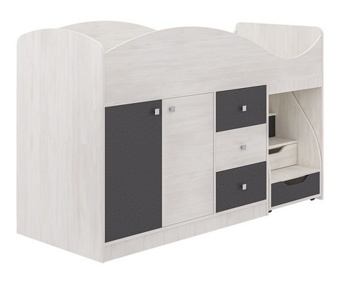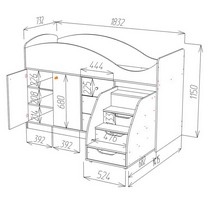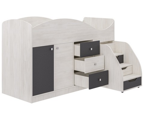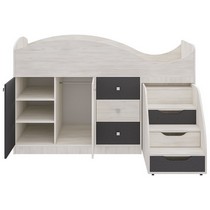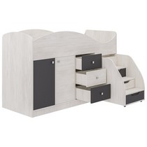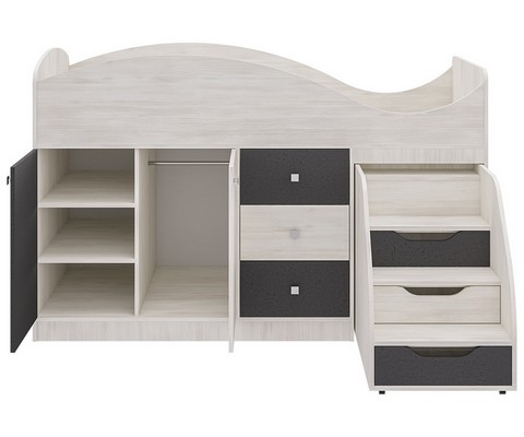 Модель включает: спальное место 180х70см, оснащено фигурной спинкой и бортиком безопасности, хромированными квадратными ручками мобильная и устойчивая лесенка с тремя закрытыми нишами три вместительных ящика полного выдвижения на шариковых направляющих шкафчик с глухими дверками на 3 ниши и полноценную зону со штангой для одежды.