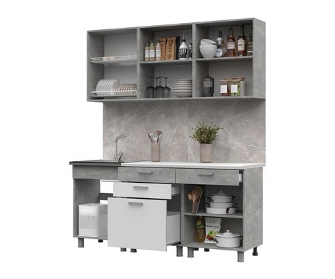 Кухня укомплектована наборной столешницей декора Антарес 26 мм. Каждый элемент столешницы закромлен по периметру, обеспечивая защиту в агрессивной влажной среде.