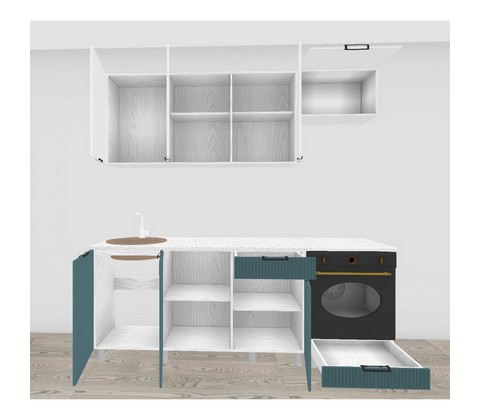 Секции с двумя выдвижными ящиками, один из которых расположен под специальной нишей для встраиваемой духовки, что является удобным и эргономичным решением для хранения противней, форм или кухонных принадлежностей.