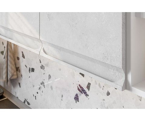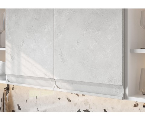 Кухня Вельвет прекрасно подойдет для квартиры с современным дизайном. Матовый эффект и имитация шлифованного бетона подчеркивает сдержанный стиль. На фасадах данной модели отсутствуют ручки, что способствует визуальному расширению пространства. Есть возможность отрегулировать высоту опор для повышения удобства использования кухни.