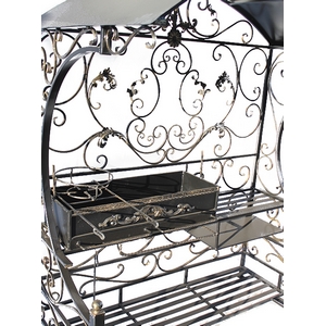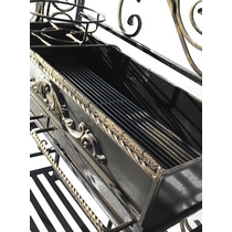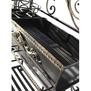 Дополнительная информация: стол этого мангала имеет размеры 69х44 см. Краска мангала имеет матовый окрас под бронзу. Топка оснащена прорезями для фиксации шампуров и держателями для вертела. В комплекте с мангалом идут кочерга и подставка для казана. Корпус оборудован подставками для бутылок, в топке расположен ящик для запекания картошки. Габариты топки – 100х37х22 см, при этом она съемная - позволяет просто чистить. Полки для кухонной утвари и для дров. Стальная крыша обеспечит защиту от непогоды.