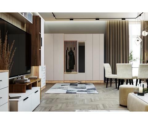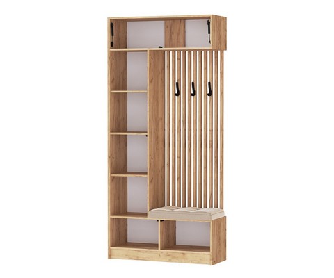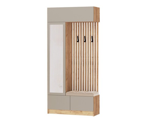 Мини-прихожая Руэлла, (дуб крафт золотой/кашемир) отличается компактными размерами, за счет чего станет оптимальным решением для квартиры-студии или малогабаритной прихожей. Благодаря наличию полок, надежных крючков и ниши под обувь модель подходит для размещения верхней одежды, уличной и домашней обуви, сезонных аксессуаров и головных уборов, а мягкое сидение, которое входит в комплект, увеличивает комфорт при надевании обуви.
