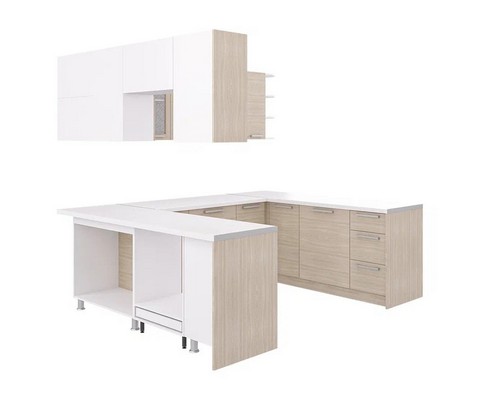 П-образная композиция разделяет обеденую зону от зоны приготовления пищу, таким образом получается кухня с барной стойкой.