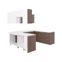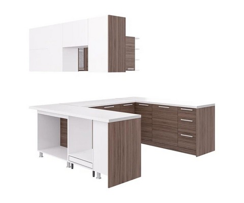 П-образная композиция разделяет обеденую зону от зоны приготовления пищу, таким образом получается кухня с барной стойкой.