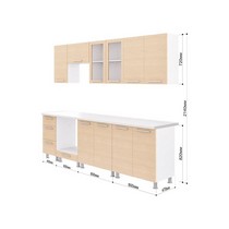 Комплектация: верхний шкаф 80 см с глухими распашными дверцами, верхний шкаф 80 см (дверцы со стеклом, шкаф над вытяжкой 60 см, верхний шкаф 40 см, нижний модуль 40 см,нижний модуль под духовой шкаф 60, 2 нижних модуля по 80 см).