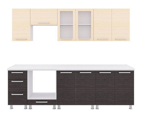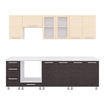 Комплектация: верхний шкаф 80 см с глухими распашными дверцами, верхний шкаф 80 см (дверцы со стеклом, шкаф над вытяжкой 60 см, верхний шкаф 40 см, нижний модуль 40 см,нижний модуль под духовой шкаф 60, 2 нижних модуля по 80 см).