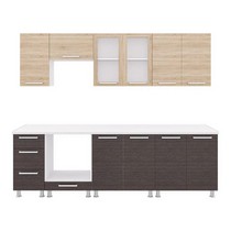 Комплектация: верхний шкаф 80 см с глухими распашными дверцами, верхний шкаф 80 см (дверцы со стеклом, шкаф над вытяжкой 60 см, верхний шкаф 40 см, нижний модуль 40 см,нижний модуль под духовой шкаф 60, 2 нижних модуля по 80 см).