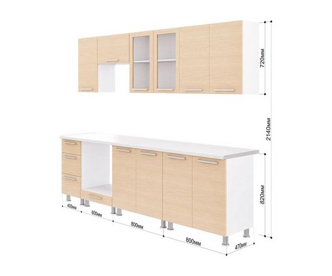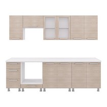 Комплектация: верхний шкаф 80 см с глухими распашными дверцами, верхний шкаф 80 см (дверцы со стеклом, шкаф над вытяжкой 60 см, верхний шкаф 40 см, нижний модуль 40 см,нижний модуль под духовой шкаф 60, 2 нижних модуля по 80 см).