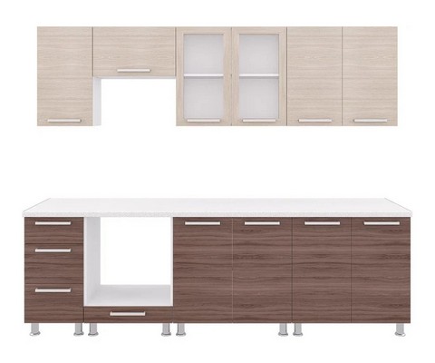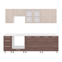 Комплектация: верхний шкаф 80 см с глухими распашными дверцами, верхний шкаф 80 см (дверцы со стеклом, шкаф над вытяжкой 60 см, верхний шкаф 40 см, нижний модуль 40 см,нижний модуль под духовой шкаф 60, 2 нижних модуля по 80 см).