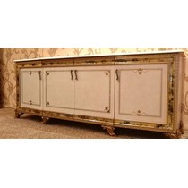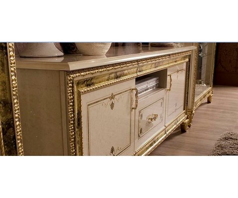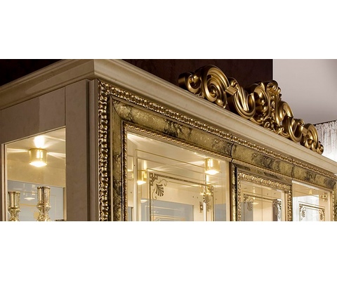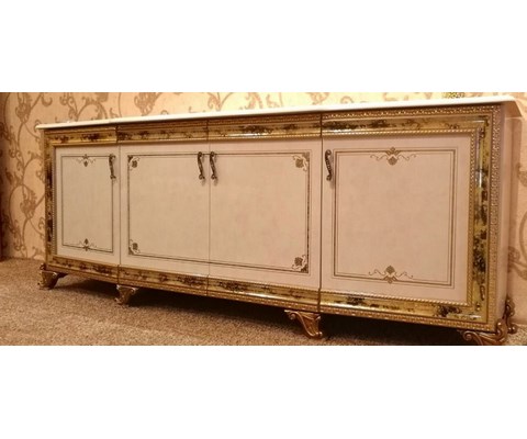 Мебель имеет трехслойное лаковое покрытие, изделия выполнены с применением трехцветной шелкографии. Объёмный декор – мебельный пенополиуретан. Кромка и стяжки - Германия. Петли, ручки - Италия. Боковины изделий – без лака.