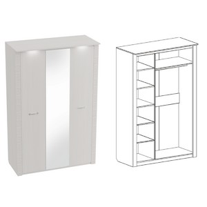 Трехдверный шкаф с зеркалом состоит из отделений с полками и штангой для вешалок.