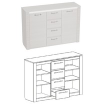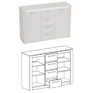 Комод с двумя отделениями и четырьмя выдвижными ящиками.