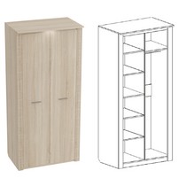 Двухдверный шкаф состоит из отделений с полками и штангой для вешалок.
