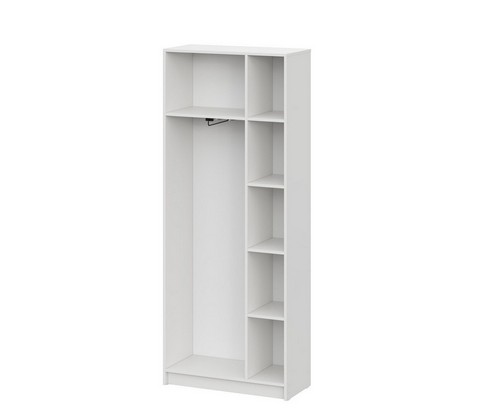 Распашные дверцы с полным доступом к внутреннему пространству, многоуровневая система полок для рационального хранения и встроенная штанга для размещения одежды на плечиках.