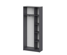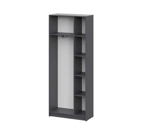 Распашные дверцы с полным доступом к внутреннему пространству, многоуровневая система полок для рационального хранения и встроенная штанга для размещения одежды на плечиках.