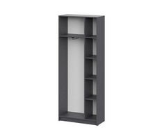 Распашные дверцы с полным доступом к внутреннему пространству, многоуровневая система полок для рационального хранения и встроенная штанга для размещения одежды на плечиках.