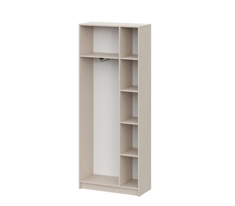 Распашные дверцы с полным доступом к внутреннему пространству, многоуровневая система полок для рационального хранения и встроенная штанга для размещения одежды на плечиках.