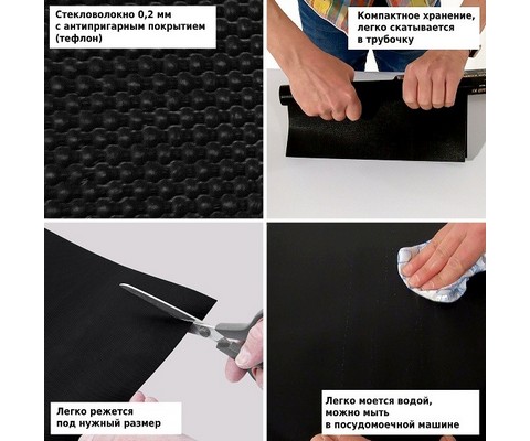 Коврик покрыт тефлоном с 2 сторон что обеспечивает равномерное распределение тепла.