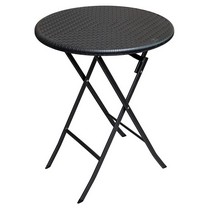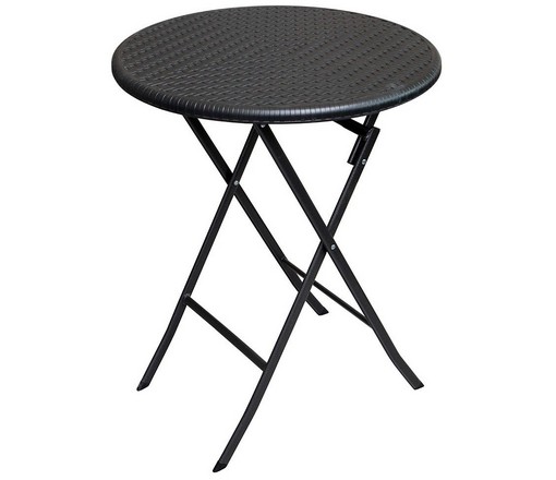 Круглая столешница выполнена из атмосферостойкого пластика тёмного цвета с имитацией плетения.