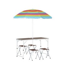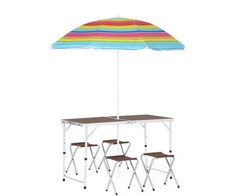 Включает удобный стол с регулируемыми ножками и отверстием для зонта, а также два прочных стула.