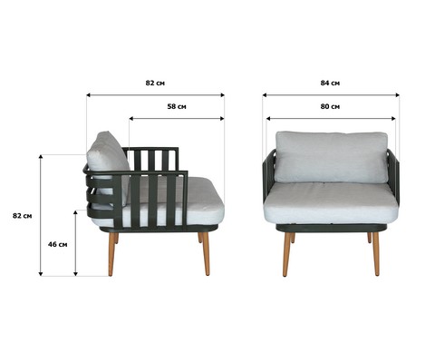 Набор мебели Эшланд серый, салатовый, бежевый состоит из 2 столиков, 2 кресел и 1 дивана.