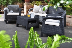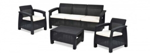 Набор дачной мебели CORFU TRIPLE SET изготовлен из пластика с имитаций под плетеный ротанг.