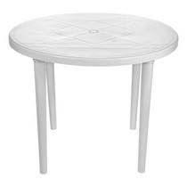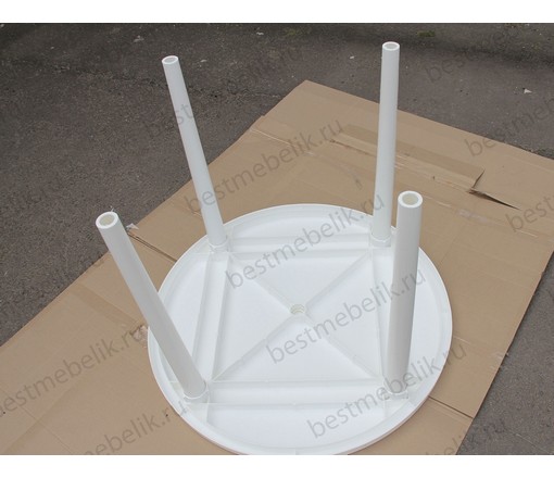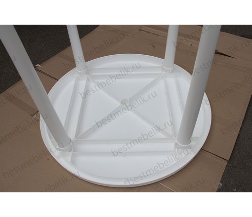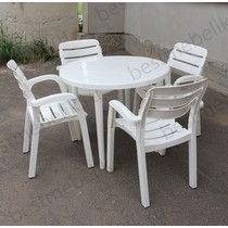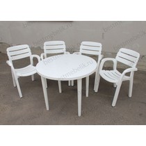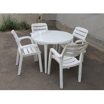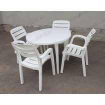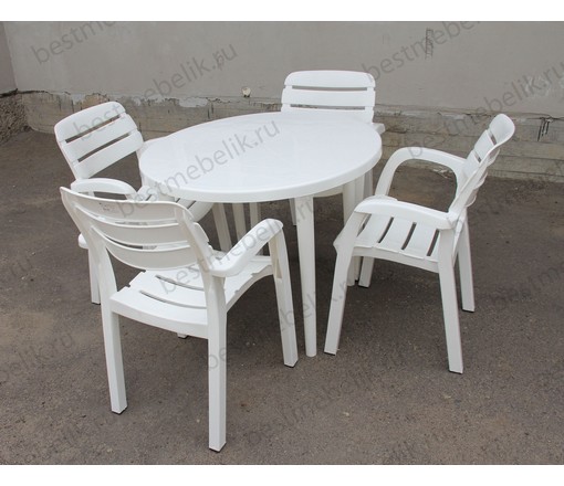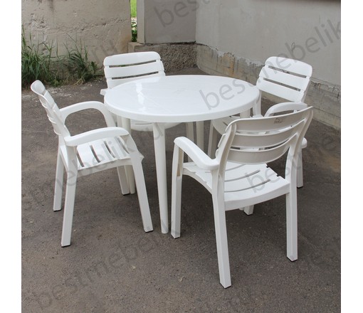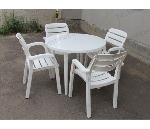 Набор пластиковой мебели состоит из компактного круглого стола и четырех кресел Далгория.
