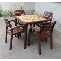 Набор пластиковой мебели состоит из компактного квадратного стола с деколем и четырех кресел Далгория.