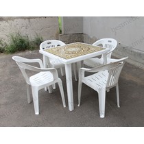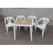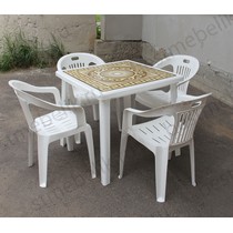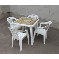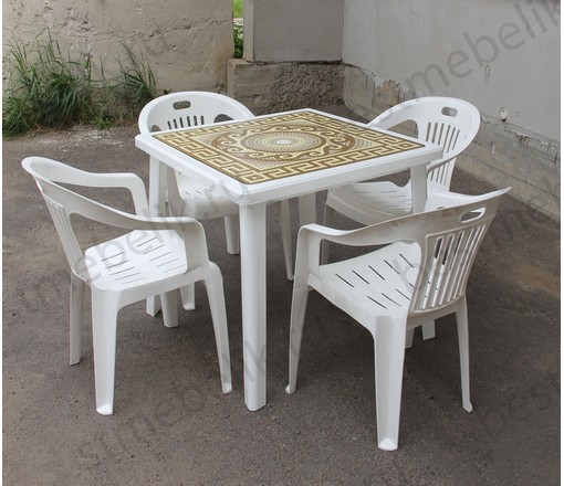 Набор пластиковой мебели состоит из компактного квадратного стола с деколем и четырех кресел Комфорт.