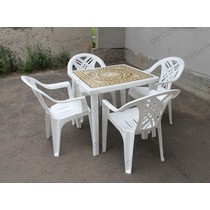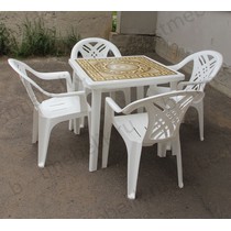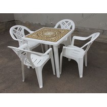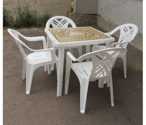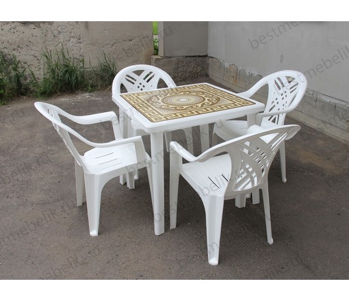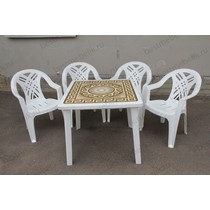 Набор пластиковой мебели состоит из компактного квадратного стола с деколем и четырех кресел Престиж.