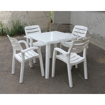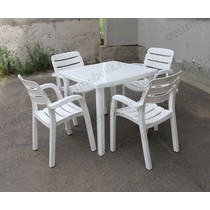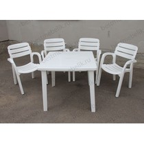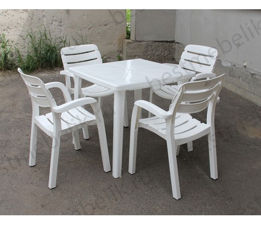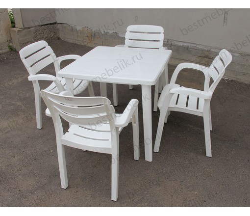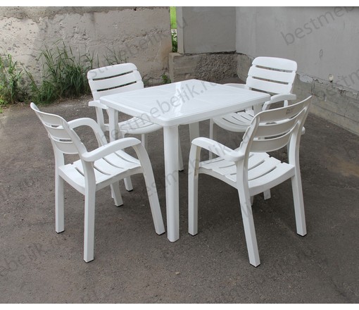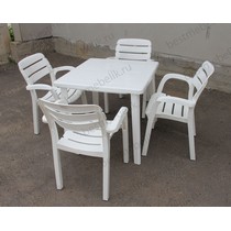 Набор пластиковой мебели состоит из компактного квадратного стола и четырех кресел Далгория.
