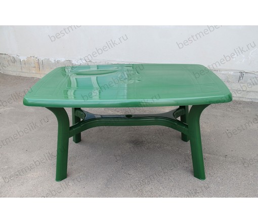 В центре столешницы предусмотрено отверстие с заглушкой для установки зонта, что делает стол удобным для использования на открытом воздухе.