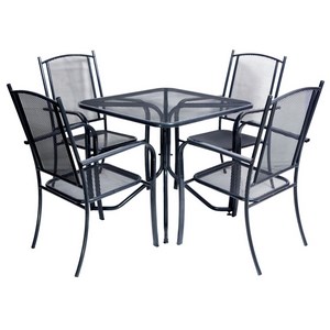 Материалы: труба диаметром 25 с полимерным покрытием, зашивка столешницы, сиденья и спинки - сетка просечно-вытяжная.