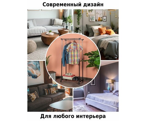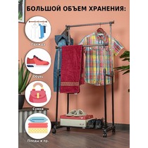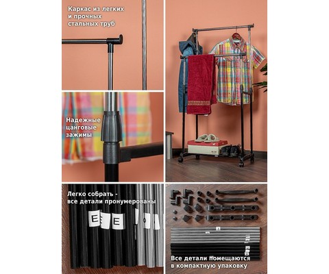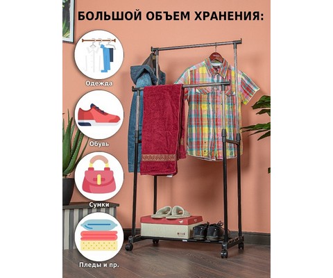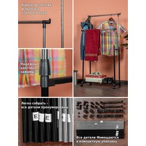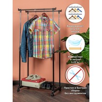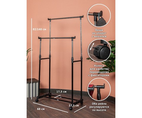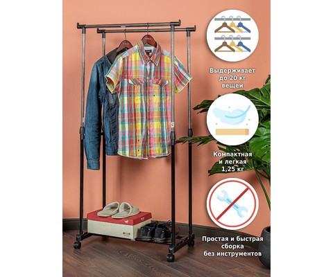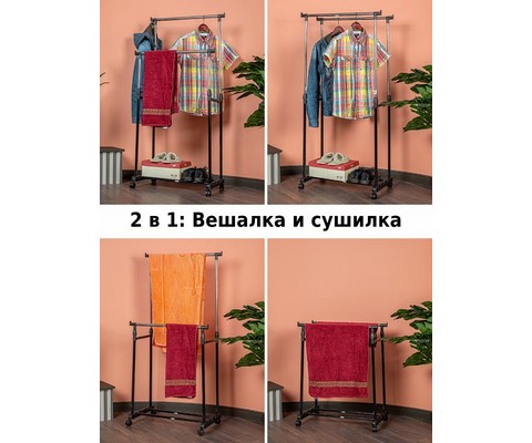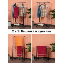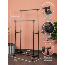 Напольная вешалка для одежды Helex Home W-12 черная/серебристая представляет собой двойную стойку на колесиках для одежды, с дополнительными крючками для аксессуаров.