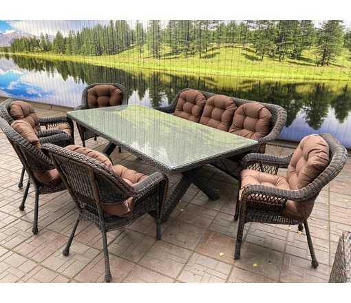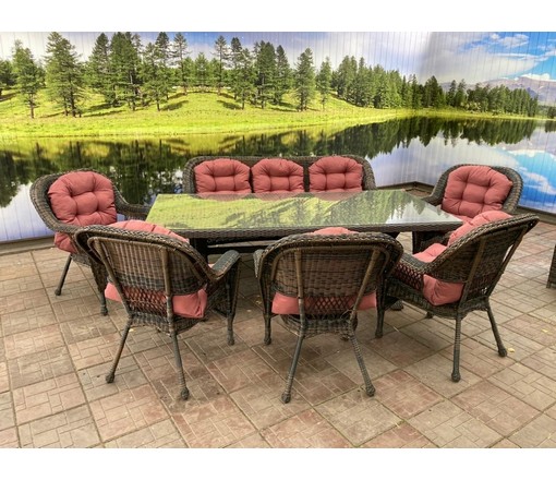 Комплект состоит из стола, 3-местного дивана и пяти кресел.