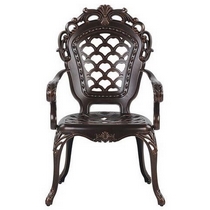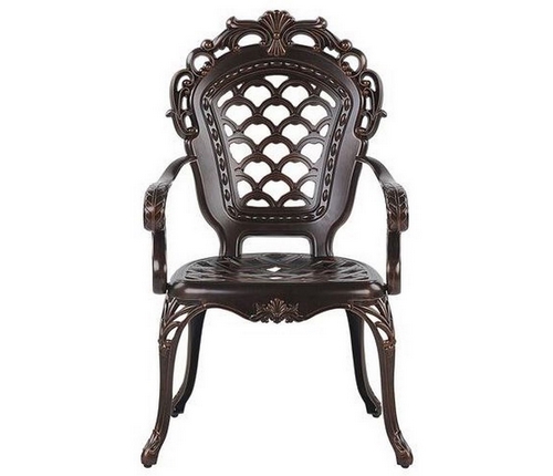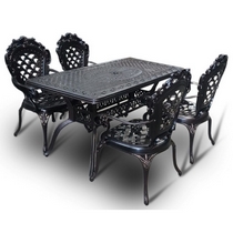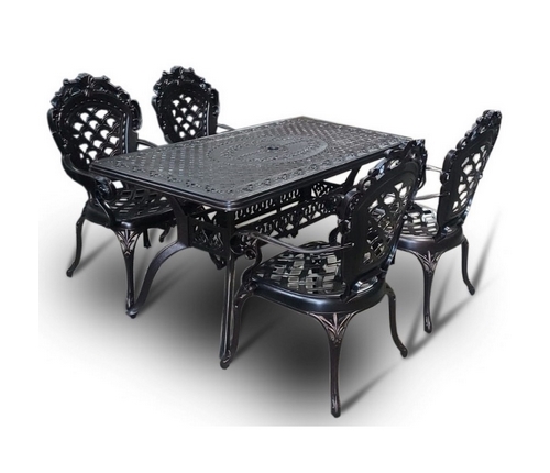 Обеденный комплект из литого алюминия состоит из стола и четырех кресел с подлокотниками.