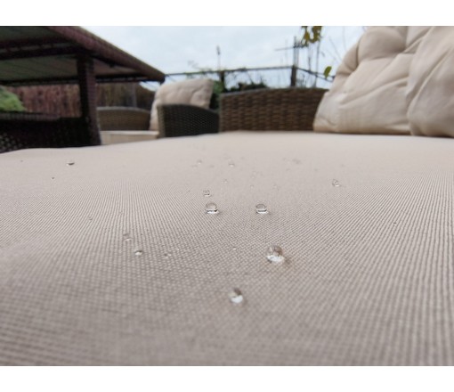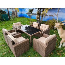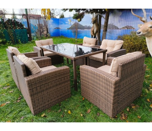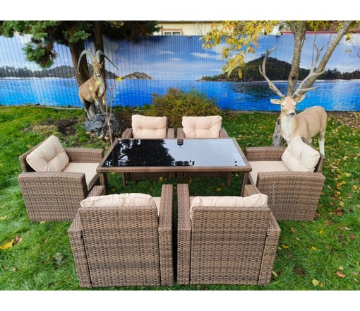 Комплект мебели из искусственного ротанга состоит из стола Милан и шести кресел Сантьяго с подушками на сиденье и спинку с водоотталкивающей обивкой.