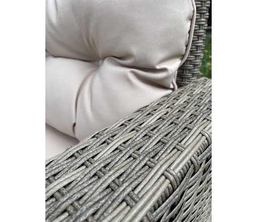 Комплект мебели из искусственного ротанга состоит из стола Милан и шести кресел Сантьяго с подушками на сиденье и спинку с водоотталкивающей обивкой.