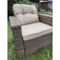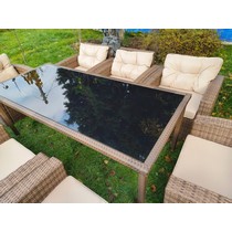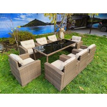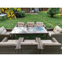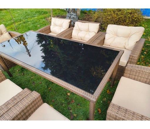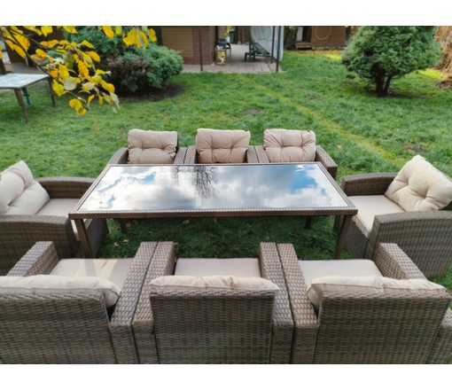 Комплект мебели из искусственного ротанга состоит из стола Египет и восьми кресел Сантьяго с подушками на сиденье и спинку с водоотталкивающей обивкой.