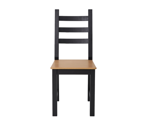 Корпус стола и стульев выполнен в черном цвете, а столешница и сиденья – в теплом светло-коричневом оттенке.