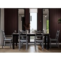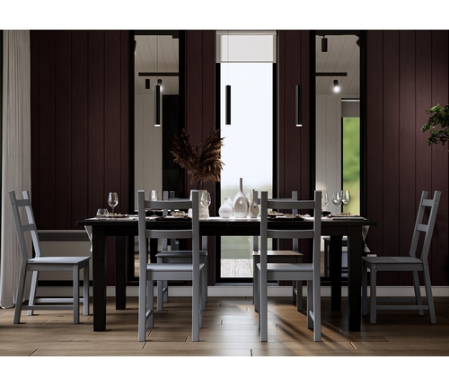 В комплект входят шесть серых стульев Удора и раздвижной стол Шань в черном цвете.