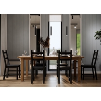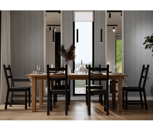 В комплект входят шесть черных стульев Удора и раздвижной стол Шань в коричневом цвете.
