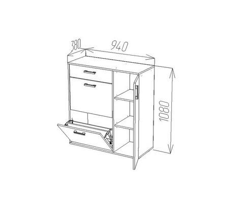Оснащение: три сдвоенных крючка, две полки, две открытые ниши, выдвижной ящик, два распашных шкафчика на две и пять полок, зеркало.