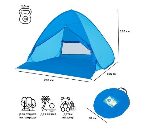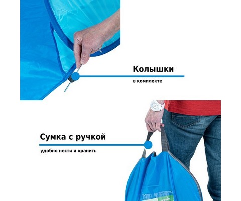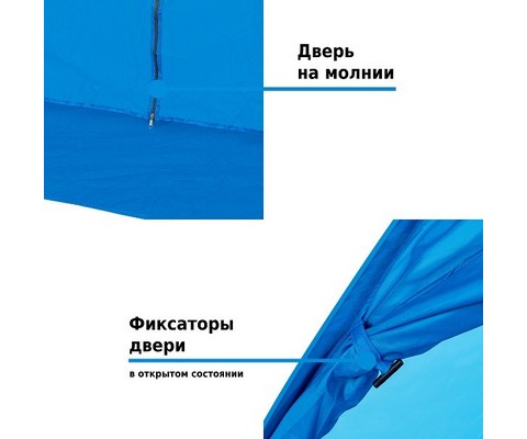 Палатка имеет двери на молнии, москитную сетку со шторкой, колышки для крепления.