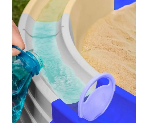 Яркая круглая конструкция с двумя сидениями и водным каналом станет любимым местом для игр на даче, во дворе или в помещении.