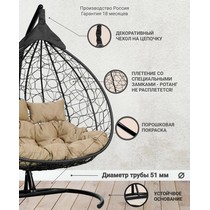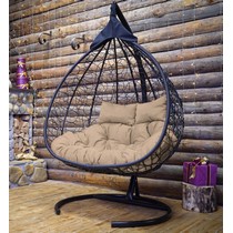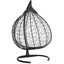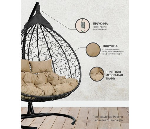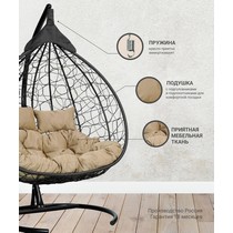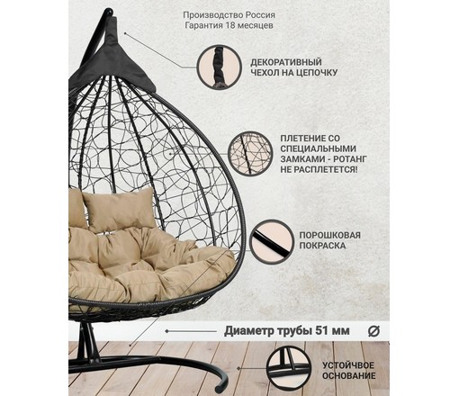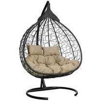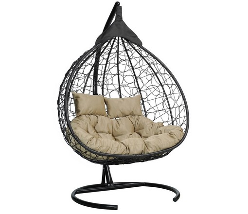 Подвесное кресло - кокон Fisht ротанг двухместное (черный/бежевый) с каркасом, подушка полиэстер