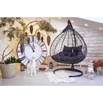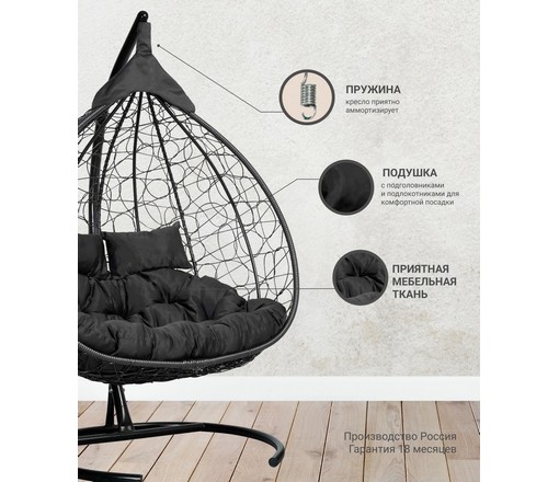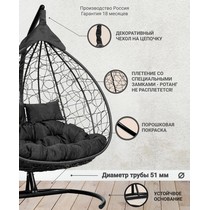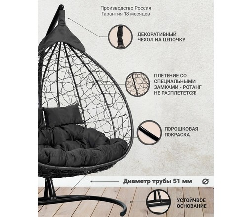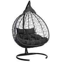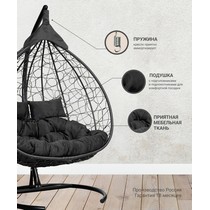 Подвесное кресло - кокон Fisht ротанг двухместное (черный/черный) с каркасом, подушка полиэстер