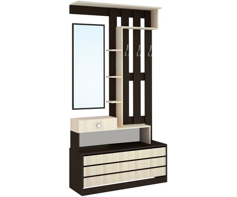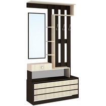 Центральная секция состоит из тумбы, вешалки для верхней одежды, полки для головных уборов, стеллажа и зеркала.